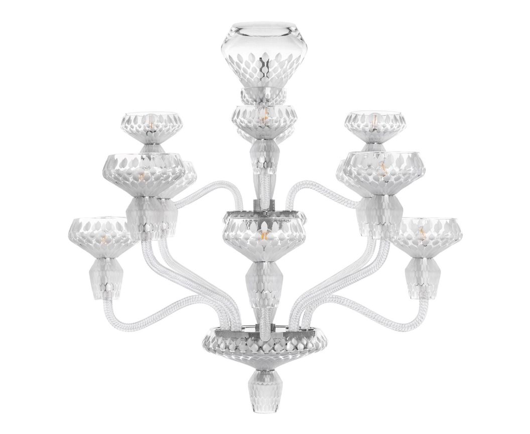 Ausgehend von der Struktur eines klassischen Kronleuchters hat Noé Duchaufour-Lawrance drei zeitgenössische Kronleuchter geschaffen, die ein neuartiges, einzigartiges und entschieden modernes Produkt darstellen. Der geometrische Schliff des Kristalls zieht sich entlang der Schalen, Becher und Baluster in klarem Kristall.