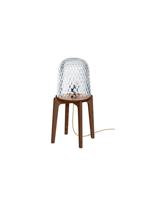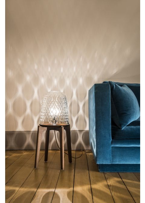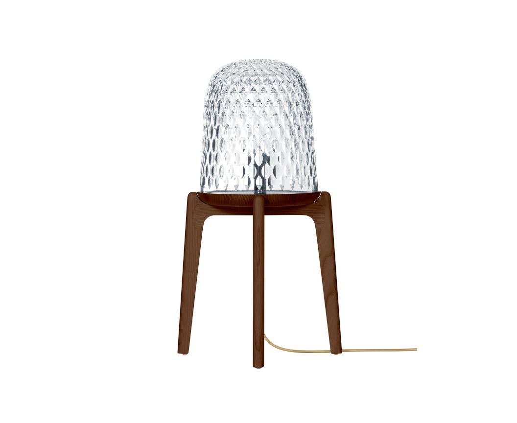 Die Beleuchtungskollektion Folia umfasst drei Modelle aus klarem Kristall und massiver Esche.