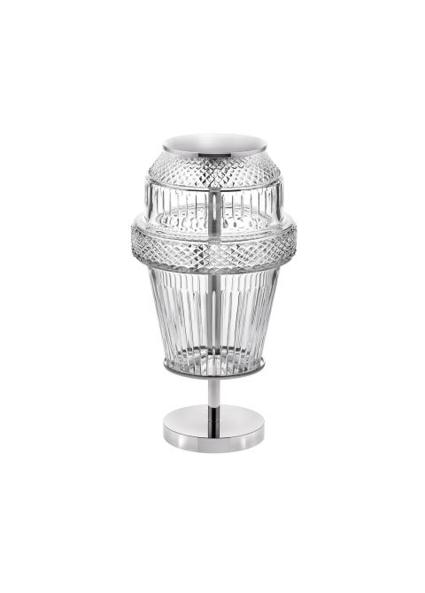 Klarer Kristall und Diamant- und Schrägschliff, Diffusor aus Japanpapier, Aluminiumstruktur mit verchromter Oberfläche Tischleuchte.