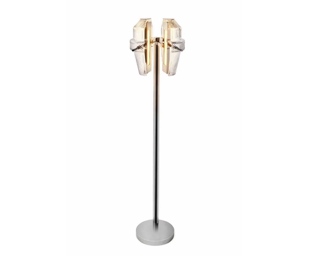 Klarer Kristall mit Diamant- und Facettenschliff, Diffusor aus Japanpapier, Struktur aus Aluminium mit vernickelter Oberfläche.