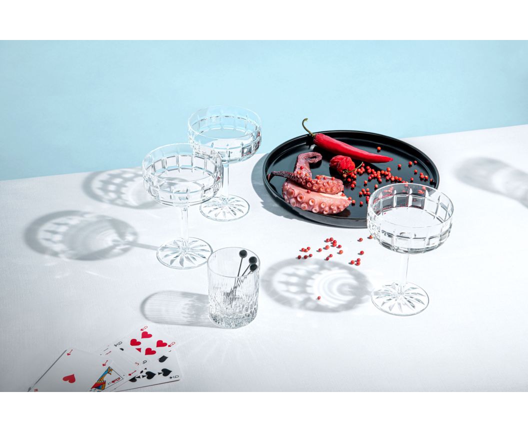 Im Jahr 1979 präsentierte die Apollo-Kollektion eine neue, zeitgemäße Vision des goldverzierten Thistle-Services und übernahm dessen grafische Merkmale, die lebhaften venezianischen Streifen und den überraschenden Schrägschnitt.