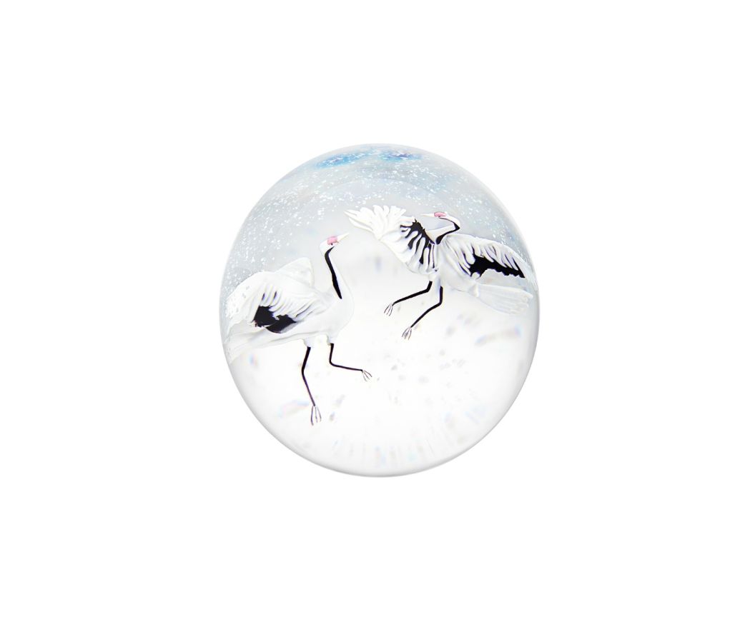 Zwei rotgekrönte Kranichfiguren wurden mit einer Lötlampe hergestellt und in eine Kugel aus klarem Kristall gehüllt. Sie sind an ihren ganz weißen Körpern, den schwarzen Hälsen und Flügelspitzenfedern sowie den leuchtend roten Kronen zu erkennen. Sie sind mit gespreizten Flügeln in Bewegung dargestellt, balzen und springen freudig.
