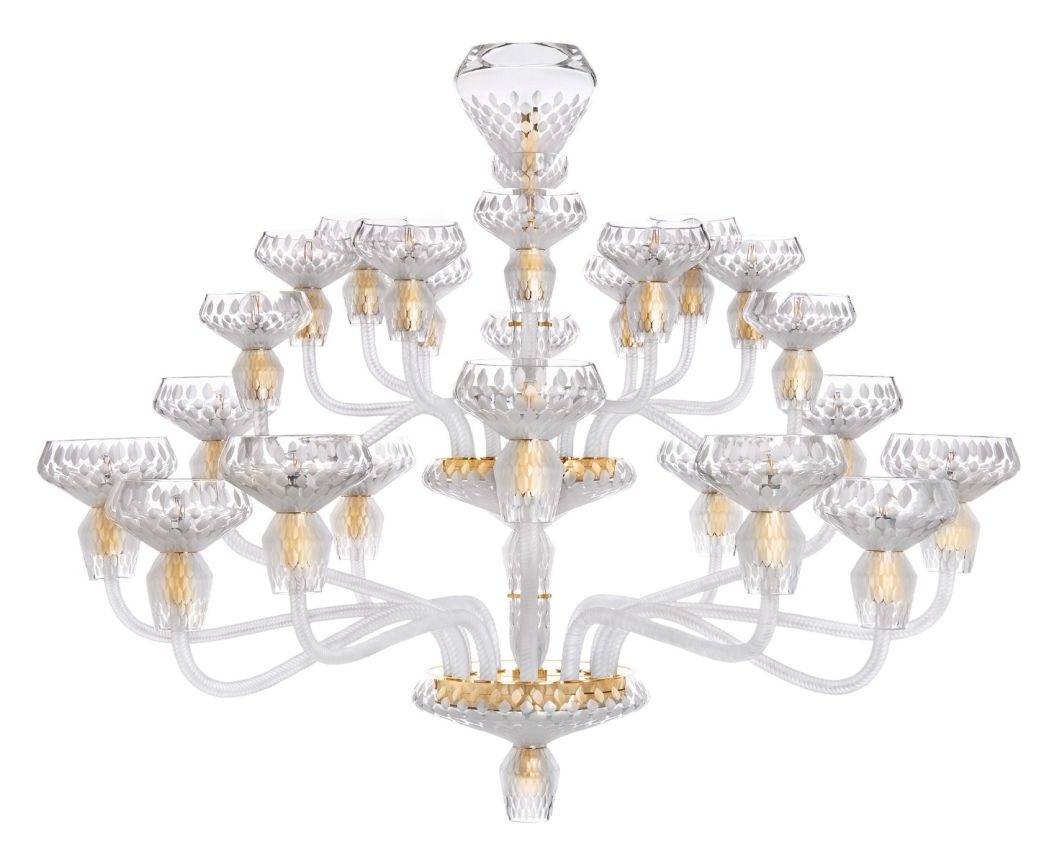 • Ausgehend von der Struktur eines klassischen Kronleuchters hat Noé Duchaufour-Lawrance drei zeitgenössische Kronleuchter geschaffen, die ein neuartiges, einzigartiges und entschieden modernes Produkt darstellen. Der geometrische Schliff des Kristalls zieht sich entlang der Schalen, Becher und Baluster in klarem Kristall.