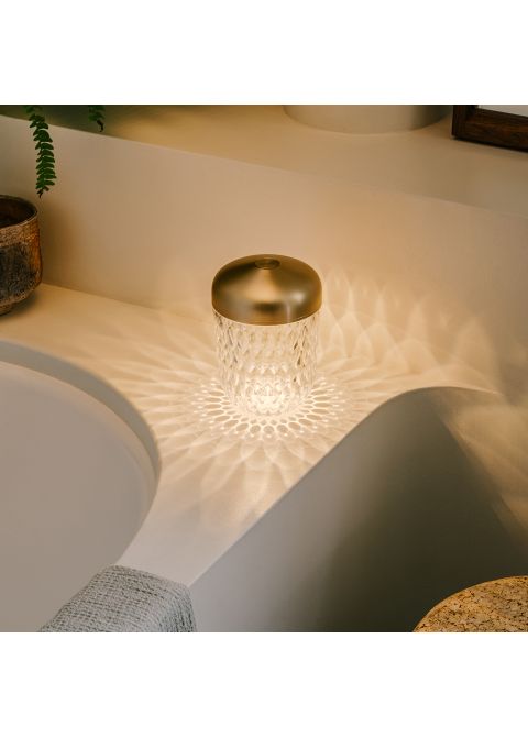 Die Mini-Version der tragbaren Leuchte ist in drei Ausführungen erhältlich: helles Gold, zartes Kupfer und warmes Silber. Drei Farben, die perfekt miteinander harmonieren und zu jeder Einrichtung passen. Sie ist wiederaufladbar, verfügt über zwei Lichttemperaturen und drei Lichtstärken und kann je nach Stimmung und Verwendung gedimmt werden.
