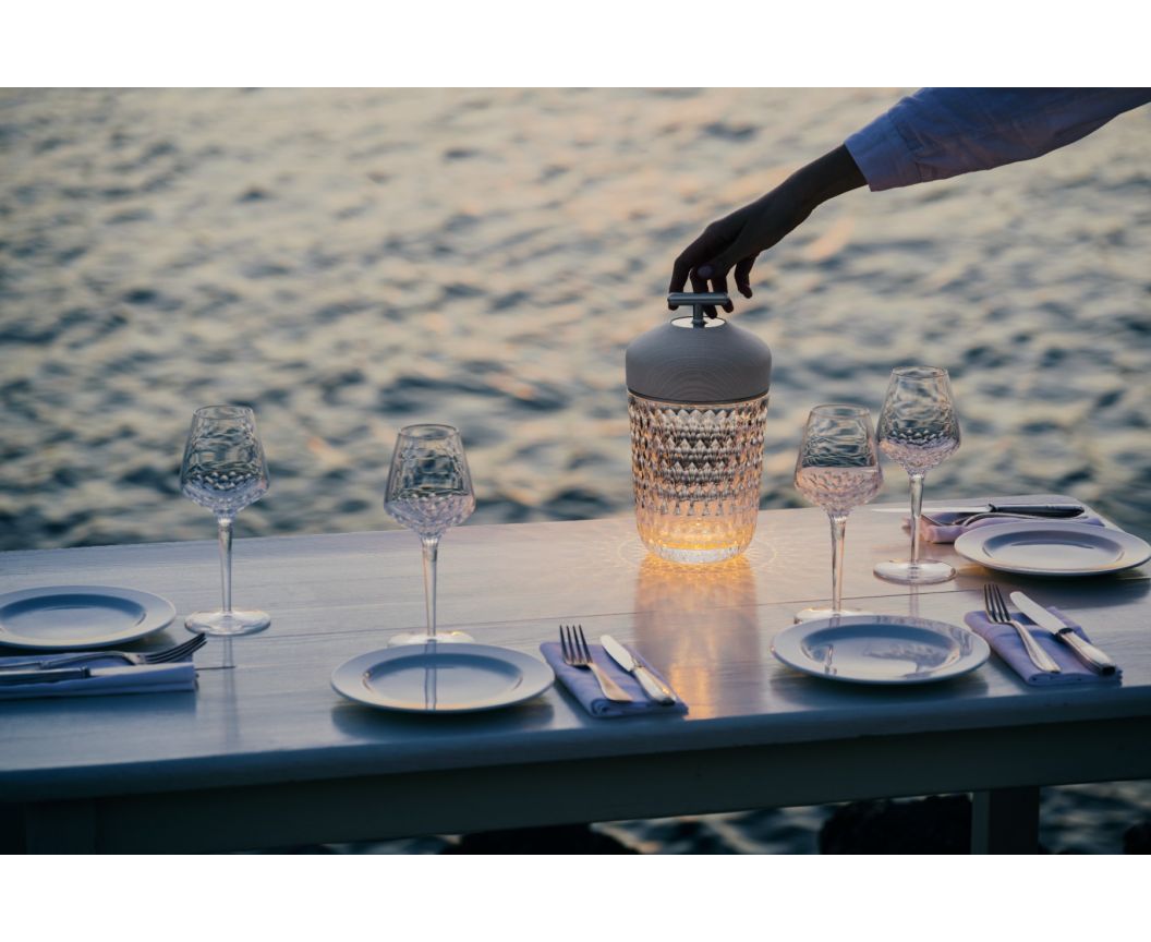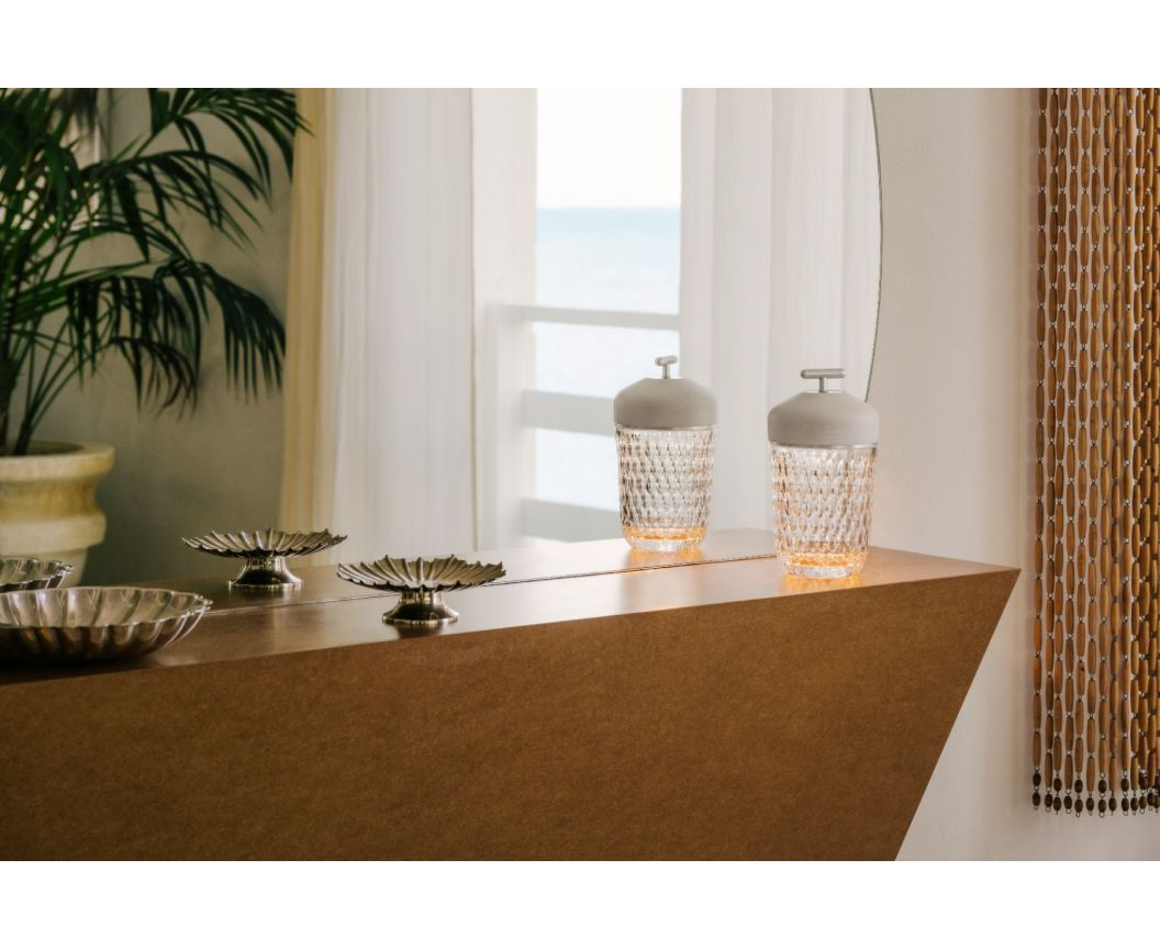 Vor allem aber ist sie ein Kondensat der Technologie im Dienste des Kristalls: eine autonome, nomadische und kabellose LED-Lampe. Sie verfügt über zwei Lichttemperaturen, ein leichtes warmes Weiß und ein extra warmes Weiß. Für jedes Lichtniveau stehen vier Intensitätsstufen zur Verfügung. Bei geringer Intensität kann sie bis zu 40 Stunden lang aufgeladen werden.