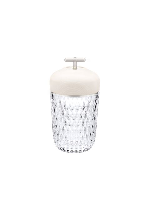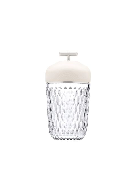 Mit ihrem modernen Design passt die tragbare Lampe aus weißem Holz in jeden Einrichtungsstil. Die Kombination aus reinem weißem Holz und glänzendem Metall bringt den Glanz des Kristalls voll zur Geltung. Das mit versetzten Schliffen geschliffene Kristall erzeugt eine leuchtende Projektion von dekorativen Motiven.