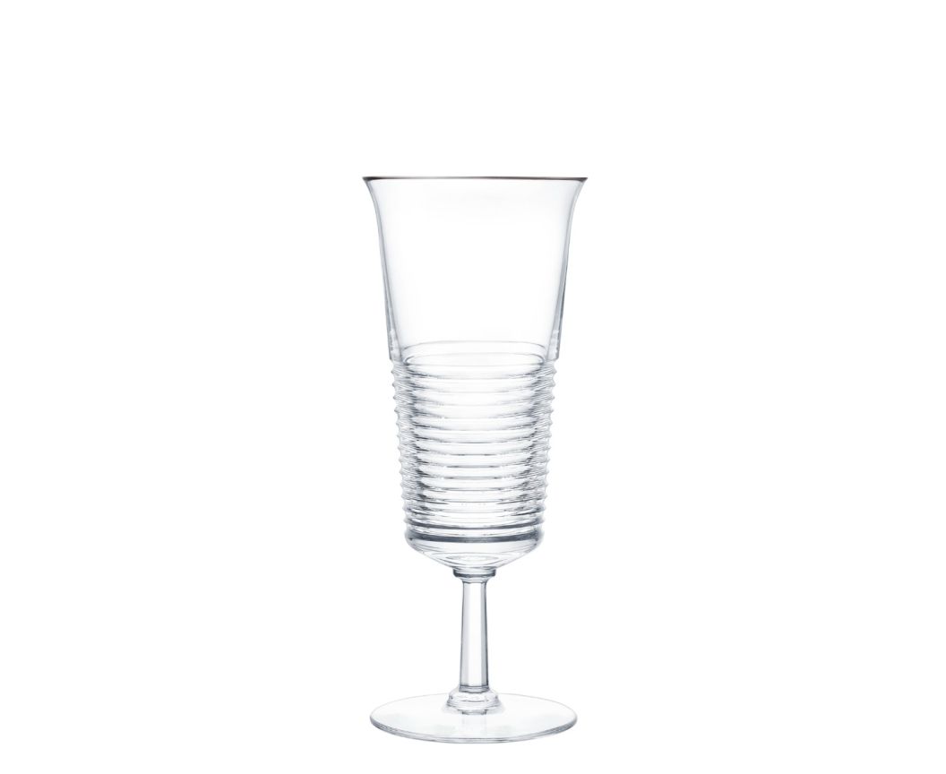 Das Tisch- und Bargeschirr von Cadence ist auch mit einem sehr dünnen Platinrand erhältlich, wie eine Bleistiftlinie, die um den oberen Rand des Glases verläuft, so Pierre Charpin. Service aus klarem Kristallglas, bestehend aus einem Wasserglas Nr. 2, einem Weinglas Nr. 3 und einer Champagnerflöte.