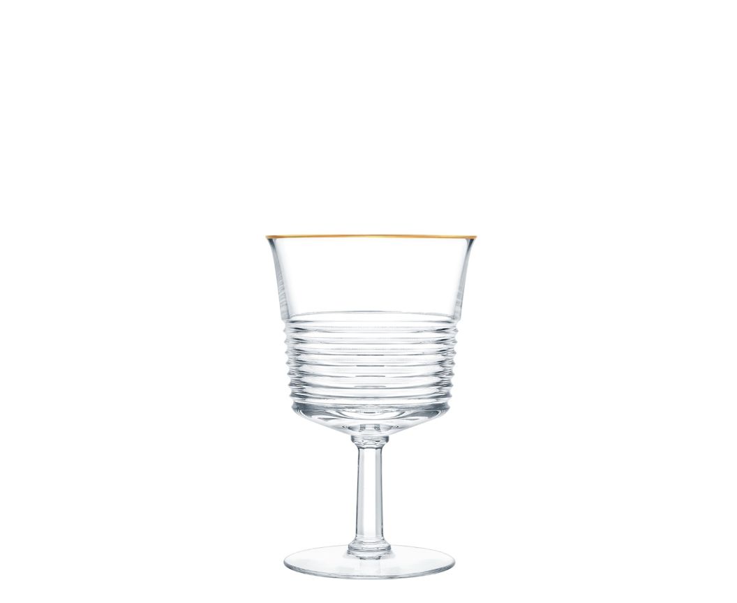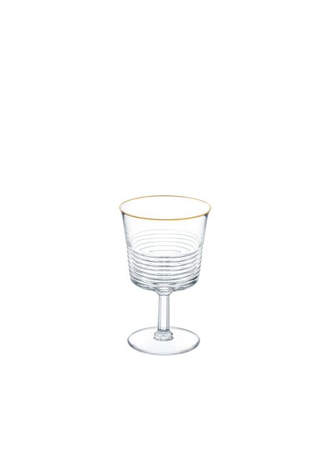 Das Tisch- und Bargeschirr von Cadence ist auch mit einem sehr dünnen Goldrand erhältlich, wie eine Bleistiftlinie, die um den oberen Rand des Glases verläuft, so Pierre Charpin. Service aus klarem Kristallglas, bestehend aus einem Wasserglas Nr. 2, einem Weinglas Nr. 3 und einer Champagnerflöte.