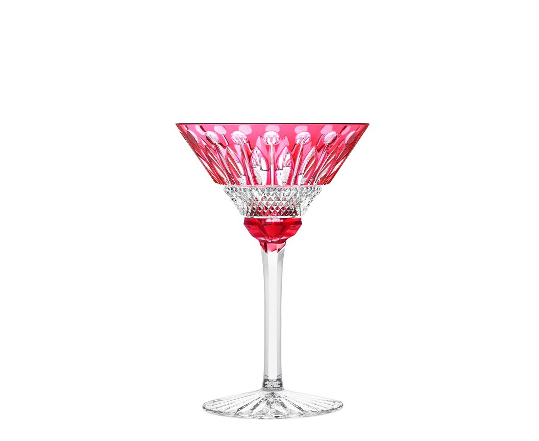 The red cocktail glass is part of a colored crystal dinner service. This also consists of a hock, a champagne flute, a highball, a small cylindrical tumbler and a medium old fashion #3.