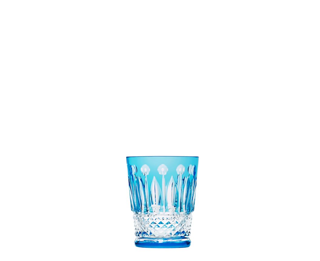 The sky-blue shot is part of a colored crystal tableware service. This also consists of a hock, a champagne flute, a highball, a small cylindrical tumbler, a cocktail glass and a medium old fashion #3.