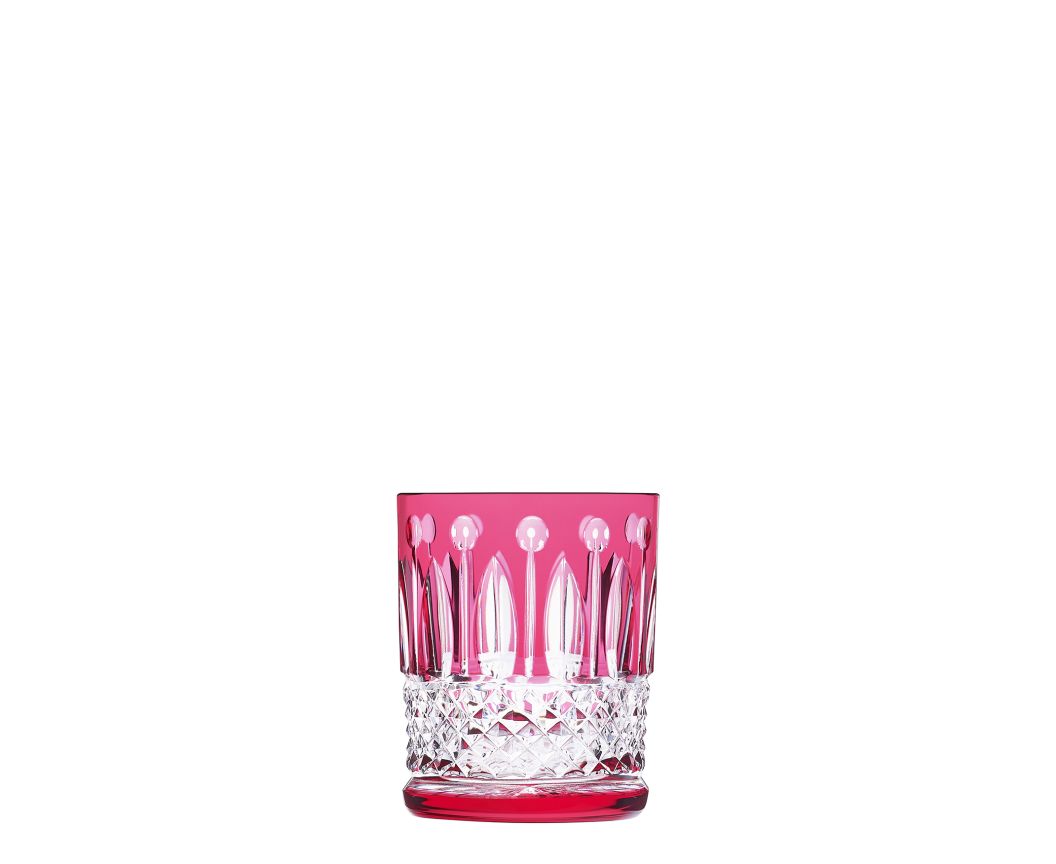 The red small cylindrical tumbler is part of a colored crystal dinner service. This also consists of a hock, a champagne flute, a highball, a cocktail glass and a medium old fashion n°3.