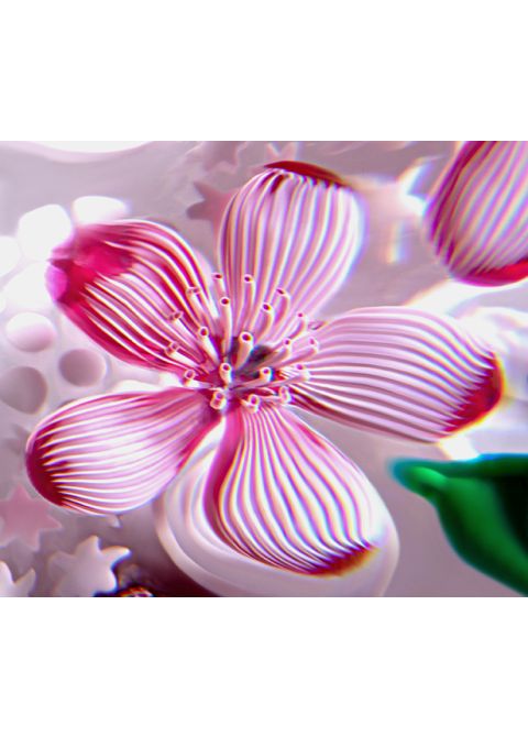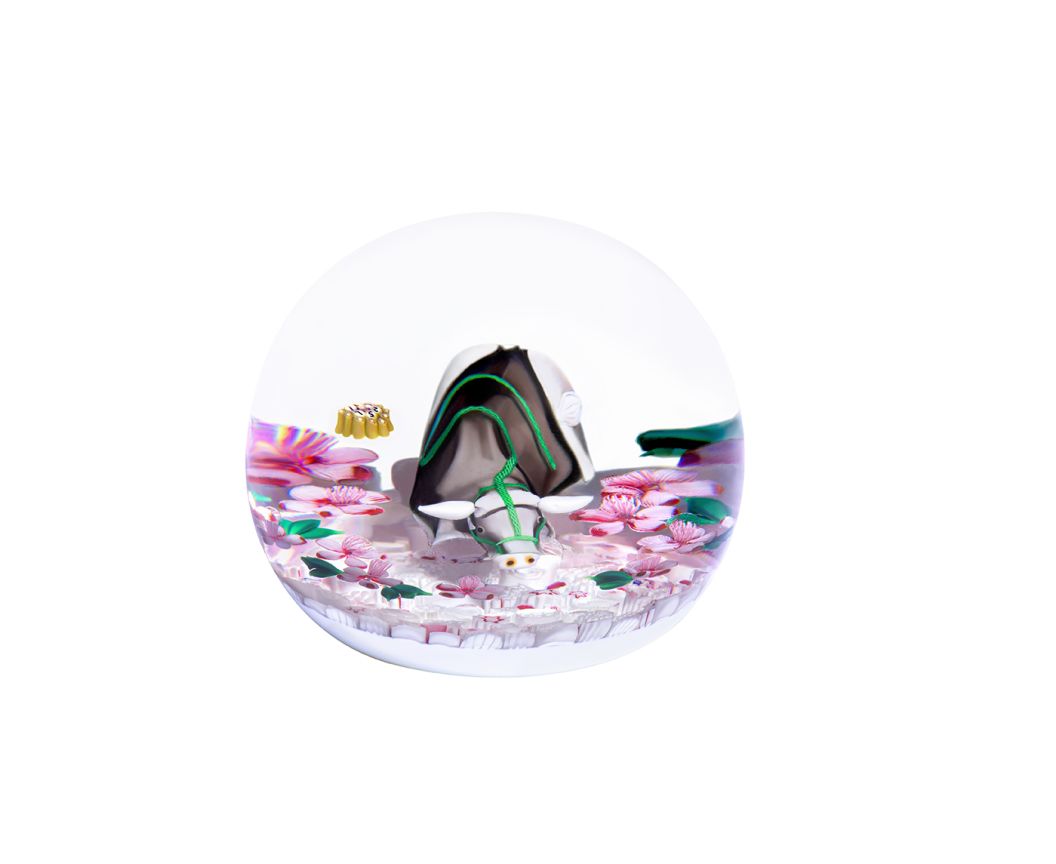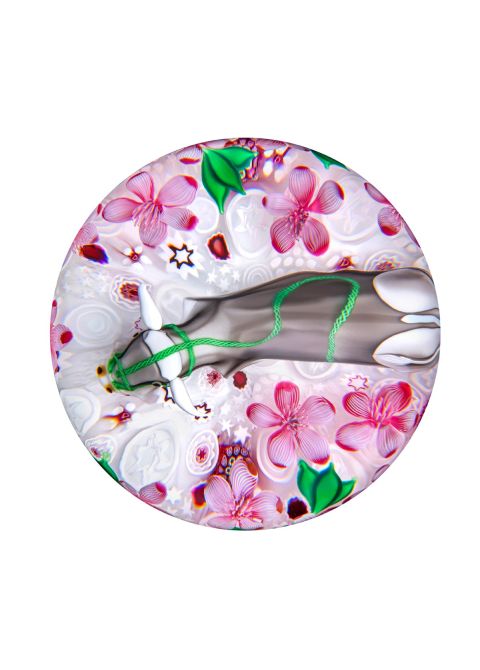 An iron grey ox rests on a starry-patterned red and white millefiori background. Peach blossoms dotted with dewdrops bloom beside it. The saturated green of its lead recalls the springtime palette of the leaves surrounding it. A gentle and sympathetic animal, the fabled ox comes down from the sky to work the fields in aide of men suffering from famine. He brings with him joy and abundance, symbolised by the spring peach blossoms that bloom all around him. His celestial origin is recalled by the stars of the millefiori and the golden cloud motif.