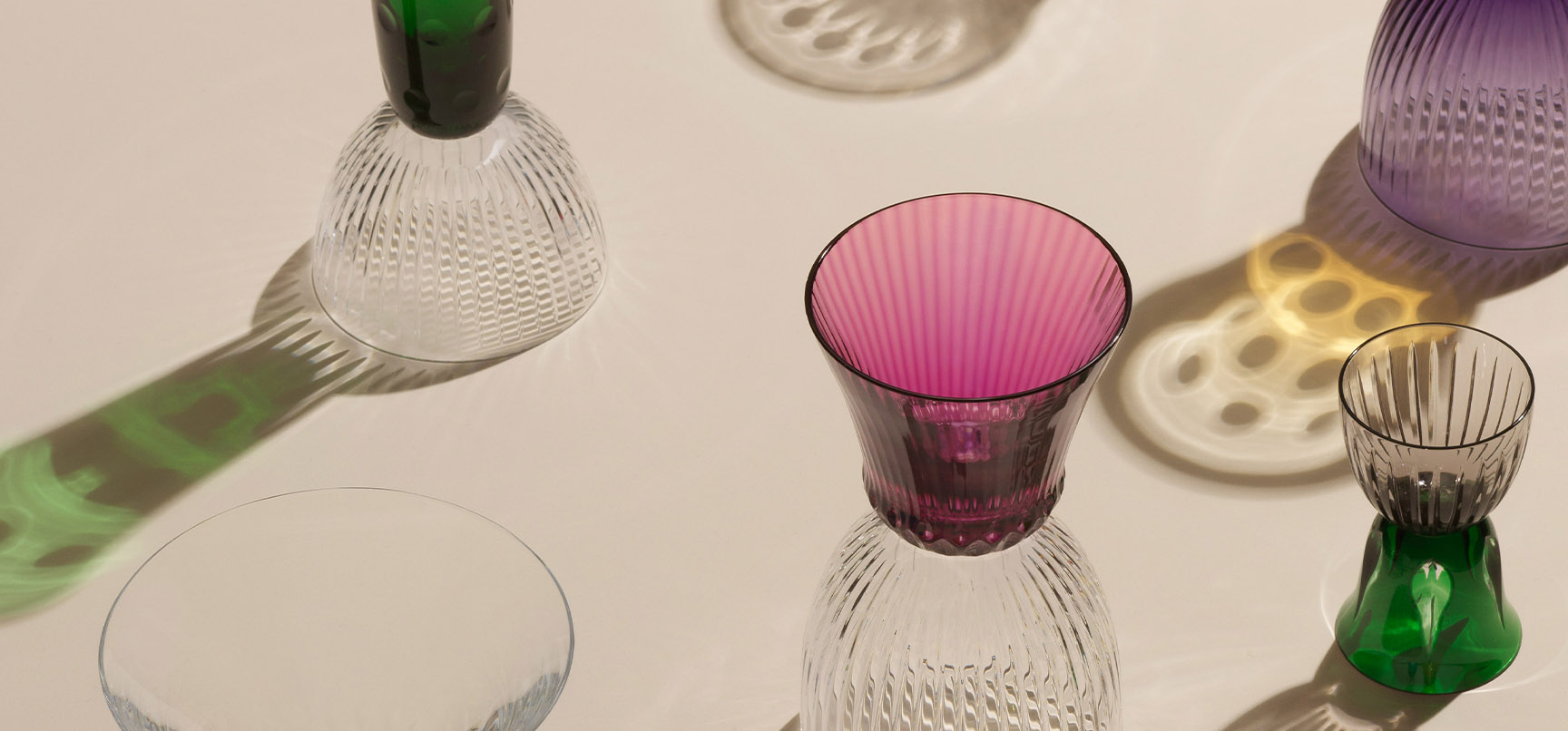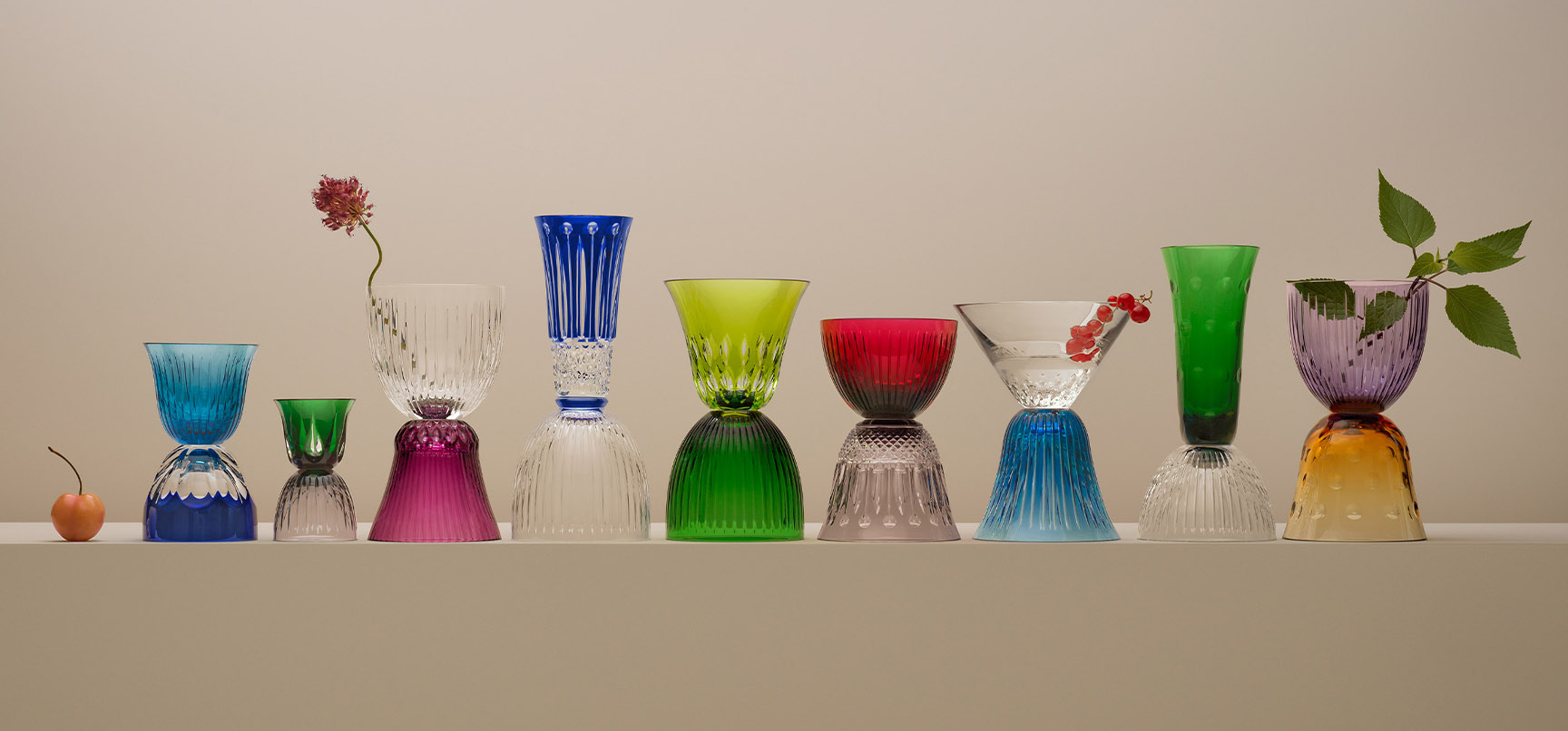 Freedom joins forces with Saint-Louis’ technical and historical excellence in a vibrant dialogue between the iconic cuts and decorations on the Tommy, Stella, Apollo and Bubbles collections, and the reincarnation of the discontinued Cerdagne and Chambord lines. In a bold palette of colours – chartreuse green, amethyst, flannel grey, deep greens and bright blues – Les Endiablés almost resemble crystal dolls, the heirs to an exceptional legacy and unleashed by the creative boldness of their designer.