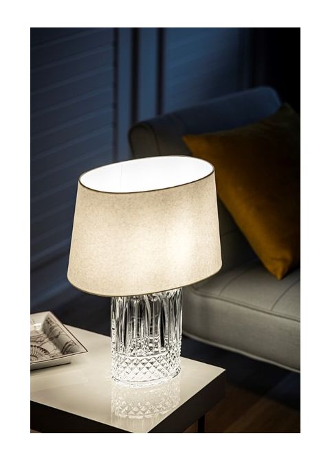 Two Tommy table lamps: small and large. Oval base in clear crystal decorated with the emblematic Tommy waist. White lampshade in Japanese paper, American oval shape.