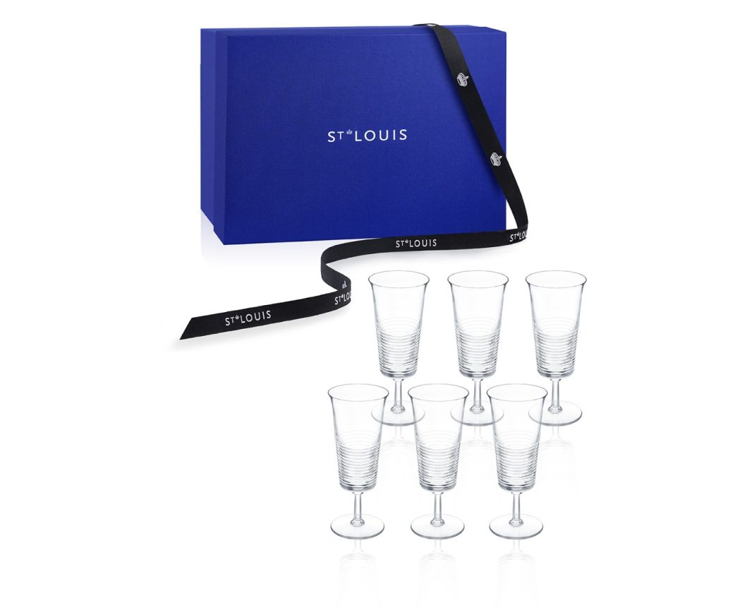 Set of six clear crystal champagne flutes. Low centres of gravity, flat vertical ribs on the stems and horizontal cords on the parisons. Flared lips.