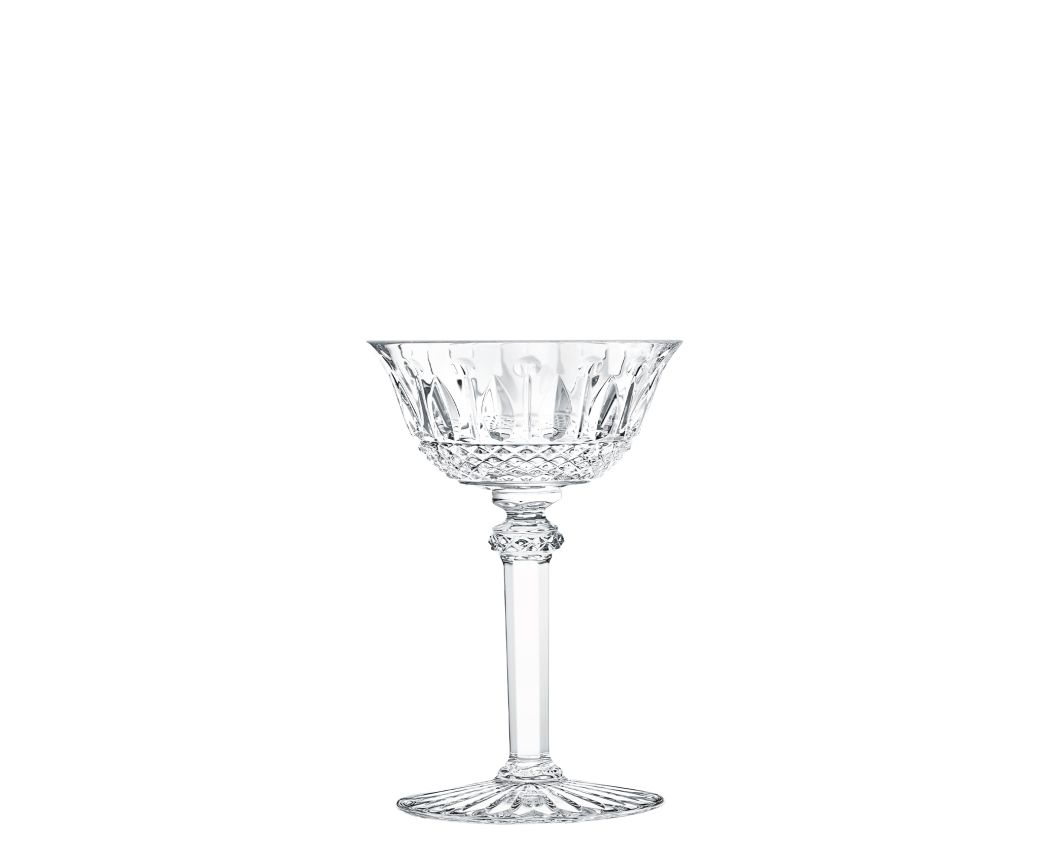 Clear crystal dinner service comprising American water glass n°1, water glass n°2, wine glass n°3, wine glass n°4, port glass n°5, liqueur glass n°6, table goblet, champagne flute and champagne glass.