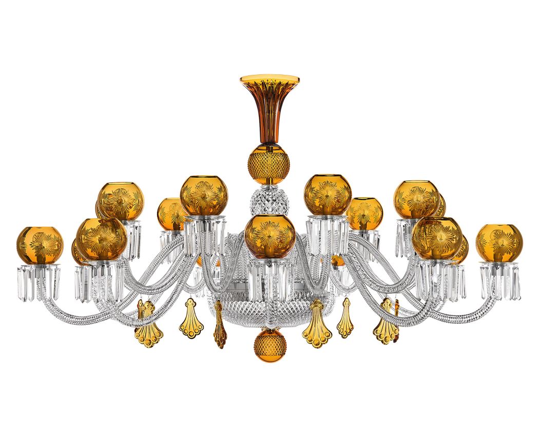 The soft curves, twisted arms and rounded hurricanes of this clear and amber crystal chandelier feature bevel, fine diamond and facet cuts that enhance the beauty of the crystal. Lately, three new horizontal and oval chandeliers, with harmonious shapes, evoke the serene splendour of an Eastern palace.
