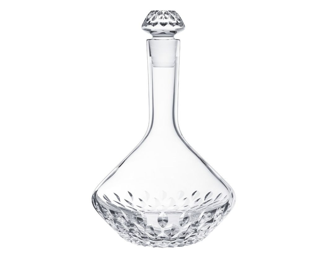 The wine carafe is part of a dinner service made up of 11 pieces in clear crystal, with the characteristic cut starting at the top of the leg and blossoming like a flower on the curve of the gob. An astonishing approach, rooted in a unique aesthetic for Saint-Louis. Noé Duchaufour-Lawrance interprets crystal cutting as a decor of geometric and organic forms.