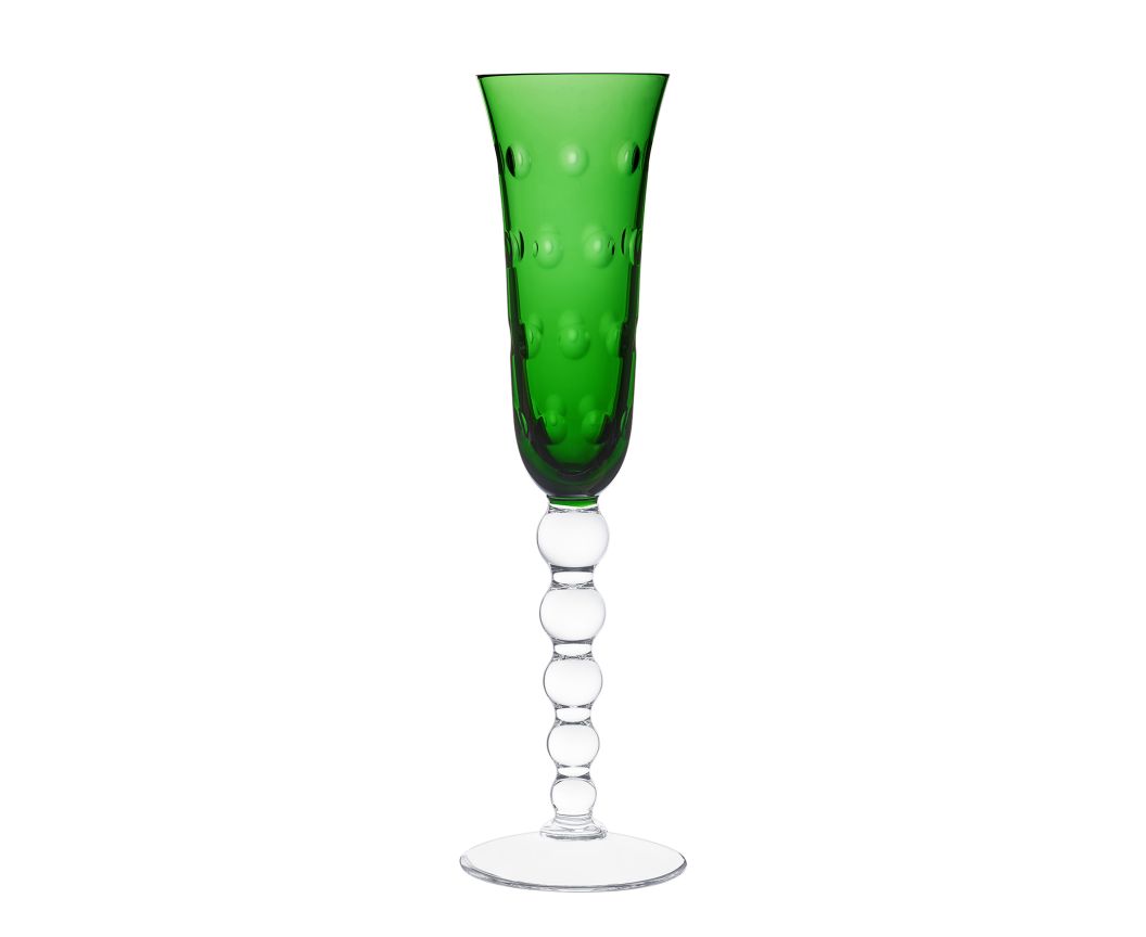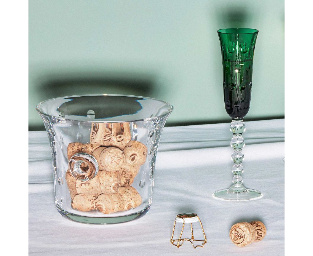 The vision of the drop of glass bead at the end of the blower's cane, both fragile and strong, inspired Teleri Ann Jones. Sparkling and sensual, developed in a vast family of shapes and uses, from the table to the bar, Bubbles has renewed the transparent, colorful creation of contemporary Saint-Louis services. The mischievous stacking of crystal beads on the leg and the goblet with sparkling bubbles are the originality of this line.