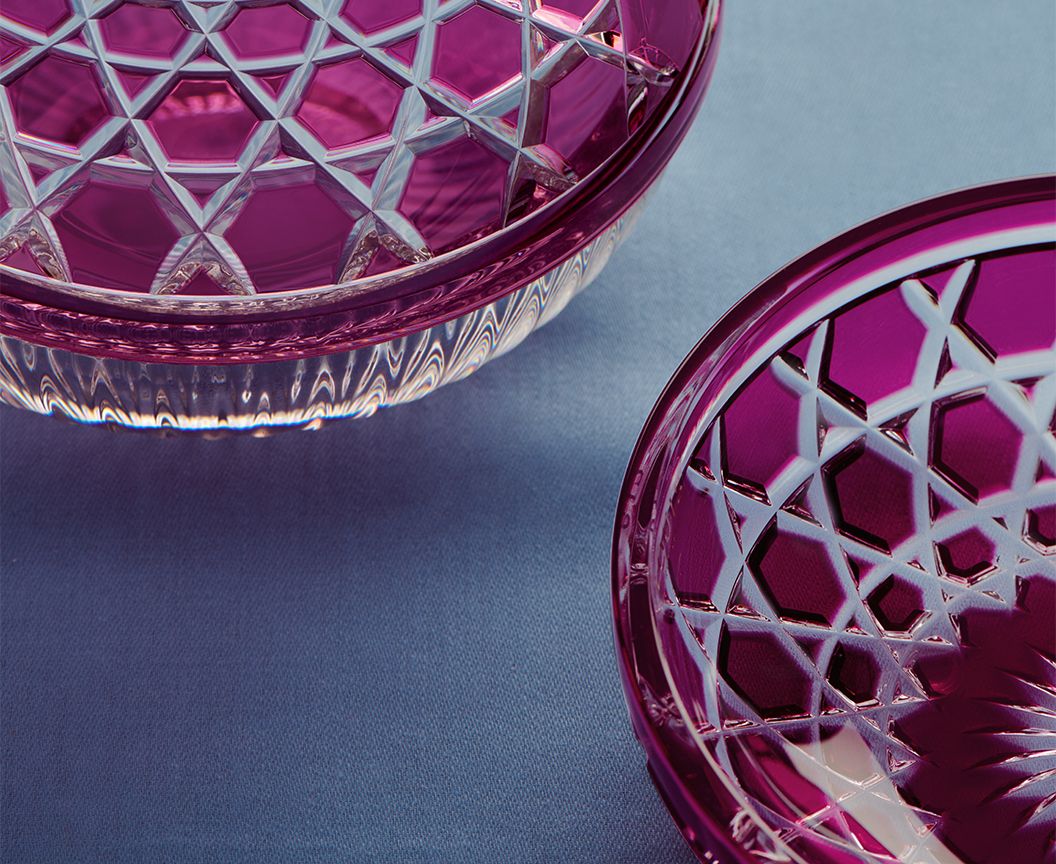 Saint-Louis' bestseller and iconic collection of timeless lighting fixtures, it is now being deployed as a matter of course in new universes. New objects emerge from it: lamps, boxes, vases... further expanding the range of possibilities. For example, chandelier wicks are transformed into acid-colored dishes and boxes. This collection is characterized by a distinctive pierrerie cut (also known as large diamonds).