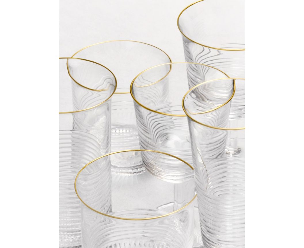 La table et le bar Cadence peuvent également se parer d’un filet or très fin sur le buvant : « comme un trait de crayon qui vient surligner la partie haute du verre », explique Pierre Charpin. Service de verres en cristal clair composé d’un verre à eau n°2, d’un verre à vin n°3 et d’une flûte à champagne.