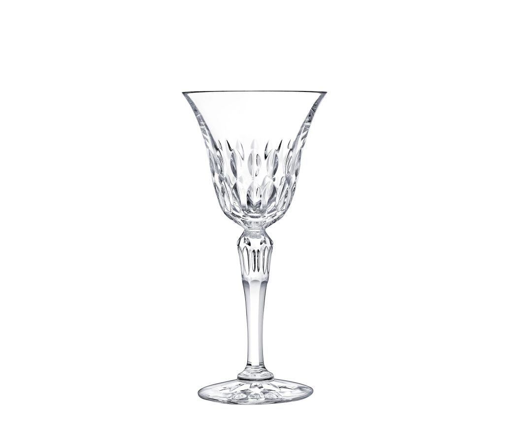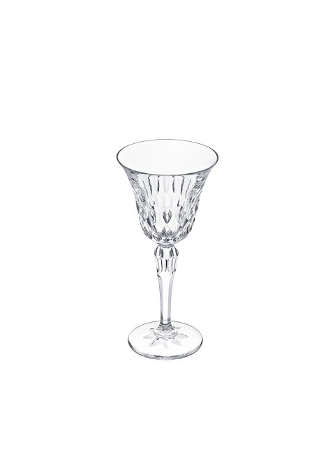 Un important décor de losanges taillés sur la paraison et le haut de la jambe et une étoile sous le pied. Service de table complet en cristal clair, les verres sont également disponibles avec une bande dorée étincelante autour du pied et du buvant.