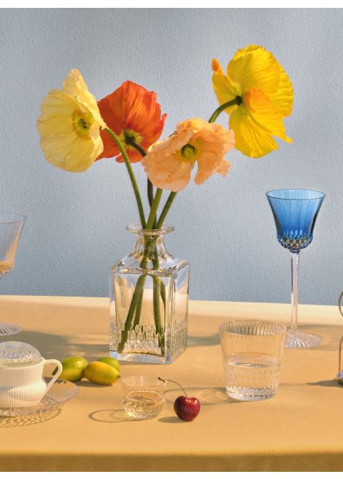Née du motif classique de la collection Thistle en 1979, la ligne Apollo présente un raffinement extrême. La fluidité des lignes et la finesse de la gravure expriment avec clarté la nature liquide essentielle du cristal. De fines côtes vénitiennes sur la paraison et la surprenante taille nic-nac coulent le long des verres Apollo, telles une cascade d'eau pure qui viendrait s'épanouir rondement.