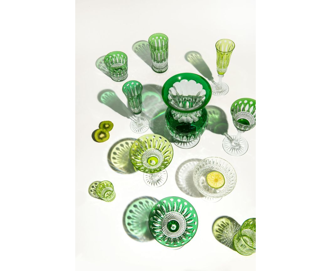 Le verre à cocktail chartreuse fait partie d'un service de table en cristal de couleur. Celui-ci se compose également d'un roemer, une flûte à champagne, une chope, un gobelet cylindrique petit et un old fashion moyen n°3.