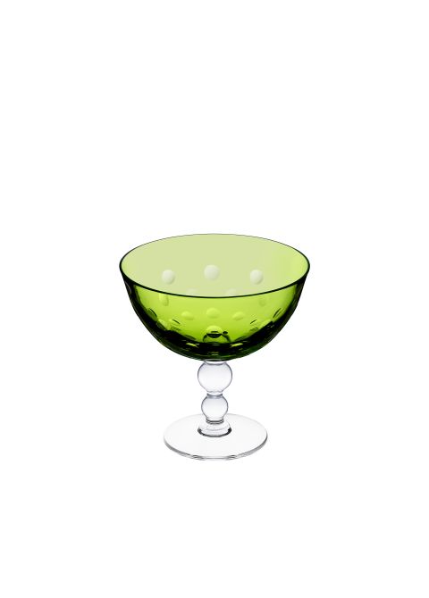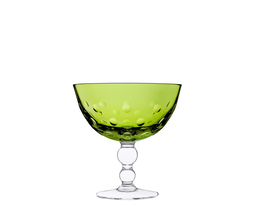 Une jambe distinctive en forme de billes, malicieusement empilées, donnant la sensation de bulles pétillantes que l'on retrouve parsemées sur les paraisons. Service de table complet en cristal clair et de couleur, complémenté d'objets de décoration qui comprend des bougeoirs, des vases ou des coupelles.
