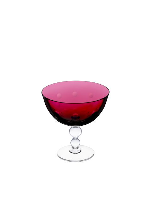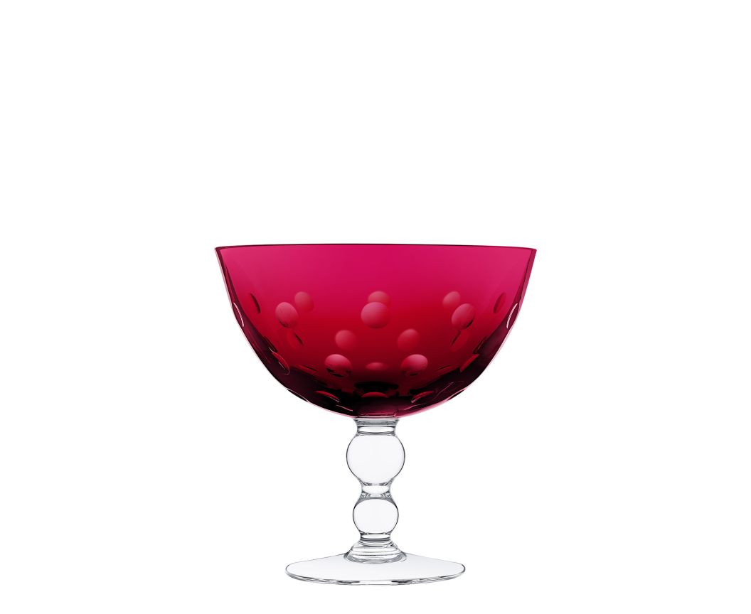 Une jambe distinctive en forme de billes, malicieusement empilées, donnant la sensation de bulles pétillantes que l'on retrouve parsemées sur les paraisons. Service de table complet en cristal clair et de couleur, complémenté d'objets de décoration qui comprend des bougeoirs, des vases ou des coupelles.
