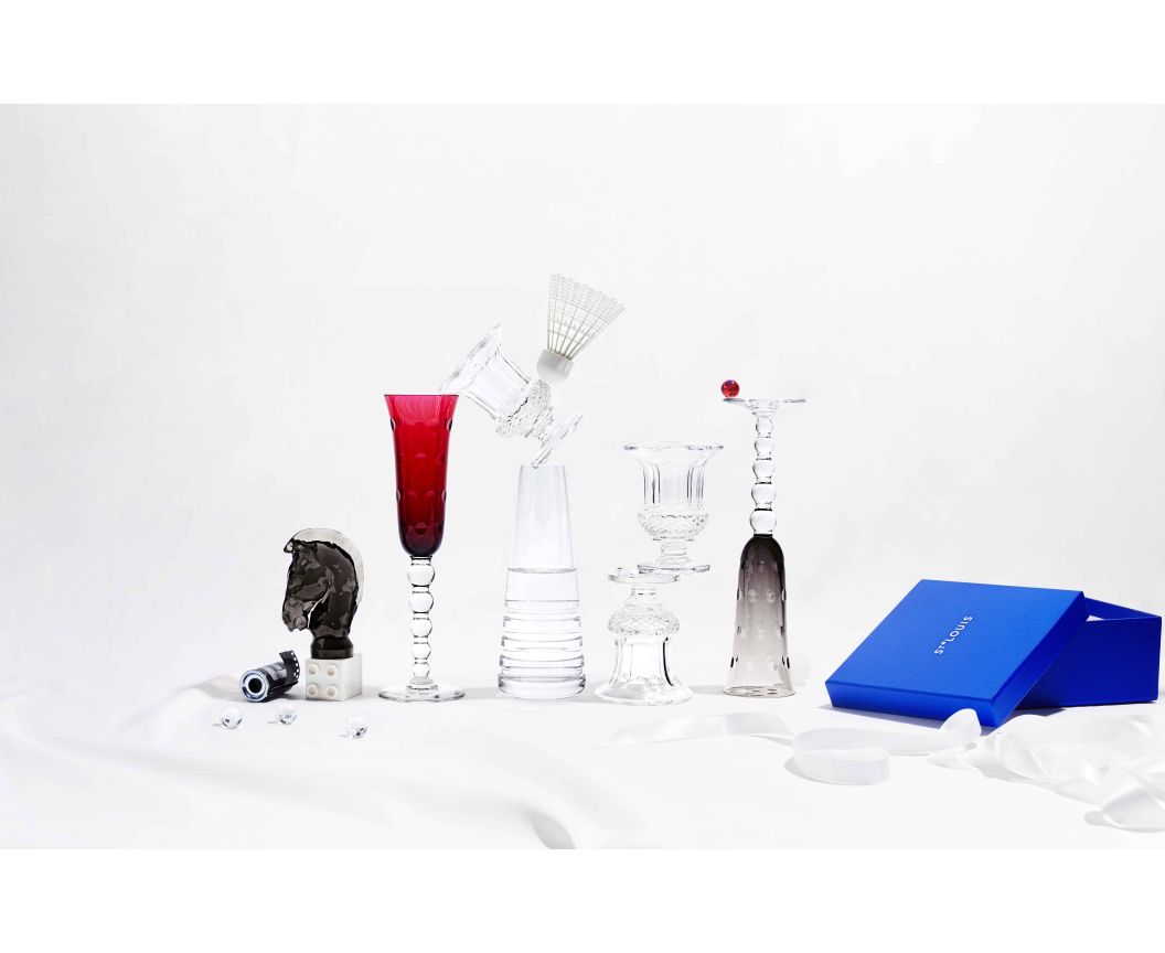 Une jambe distinctive en forme de billes, malicieusement empilées, donnant la sensation de bulles pétillantes que l'on retrouve parsemées sur les paraisons. Service de table complet en cristal clair et de couleur, complémenté d'objets de décoration qui comprend des bougeoirs, des vases ou des coupelles.