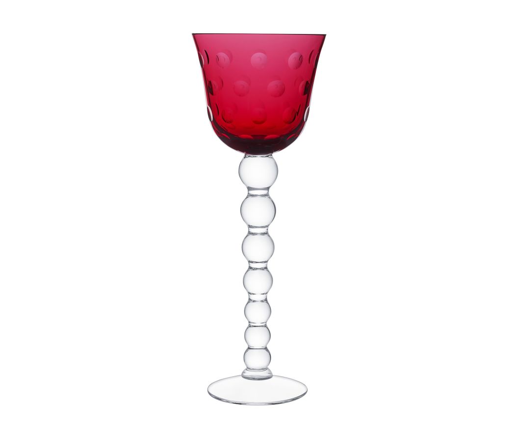 Une jambe distinctive en forme de billes, malicieusement empilées, donnant la sensation de bulles pétillantes que l'on retrouve parsemées sur les paraisons. Service de table complet en cristal clair et de couleur, complémenté d'objets de décoration qui comprend des bougeoirs, des vases ou des coupelles.