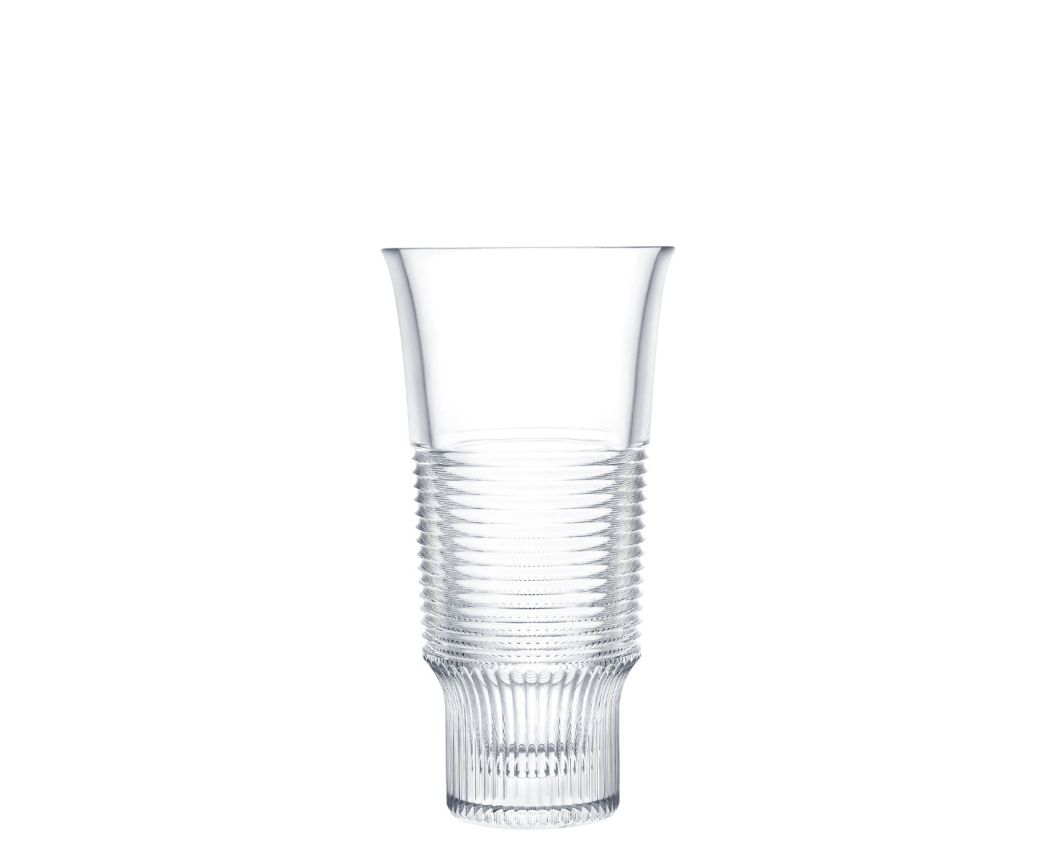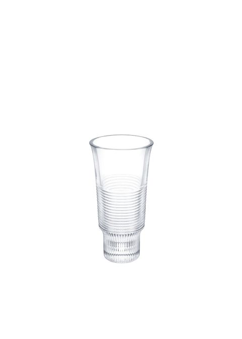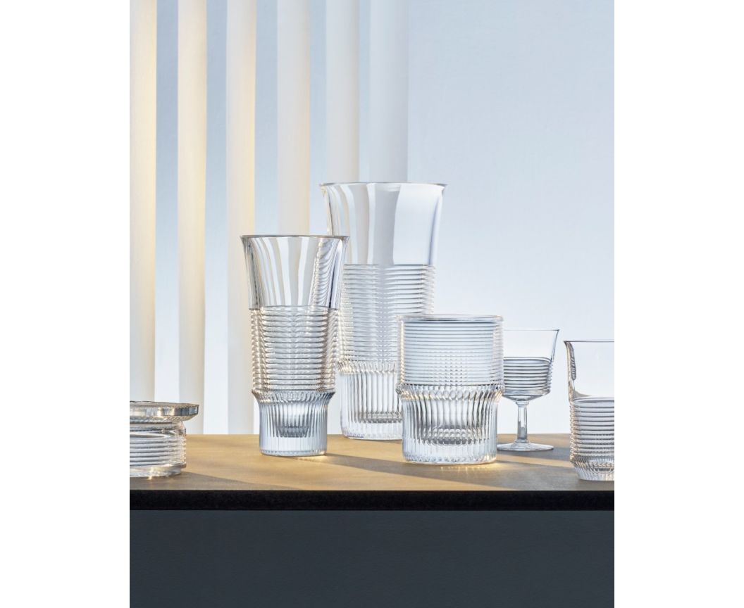 Fruit de la rencontre entre une manufacture séculaire et un design radical, Cadence se distingue par sa simplicité formelle et contemporaine. Le dessin de Pierre Charpin rythme la matière Le motif régulier des lignes inscrites dans le cristal est savamment adapté aux contraintes du matériau, grâce au savoir-faire des verriers. La régularité des sillons gravés dans la matière en réhausse l’éclat et la clarté. La partition qui se joue ici laisse deviner le travail tenace que requiert toute maîtrise d’un geste, qu’il s’agisse de dessin à main levée ou de ceux qui composent l’art verrier.