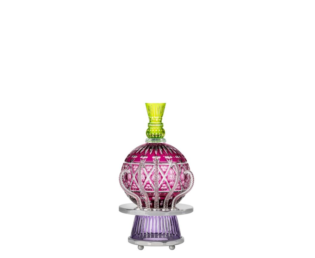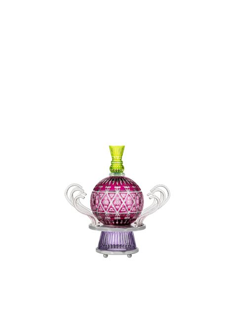 La pièce en cristal Soprano est composée de 65 pièces en métal et en cristal doublé dans des teintes améthyste, chartreuse et violet. Elle mesure 59cm de hauteur pour un poids de 16 kilos.