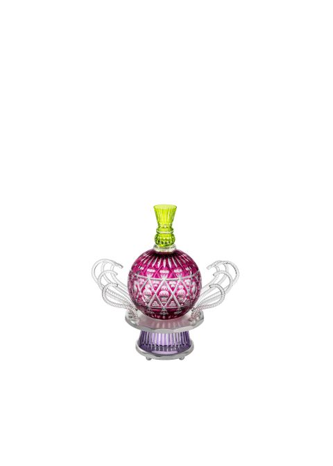 – Composition de la pièce : 1 boule en cristal doublé améthyste, 1 soliflore en cristal doublé chartreuse dévissable, 1 cône en cristal doublé violet, 10 roseaux en cristal clair, 2 plateaux et 4 pieds en aluminium anodisé légèrement brossé. Au total, 65 composants sont assemblés sur cette pièce.