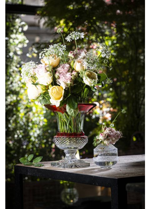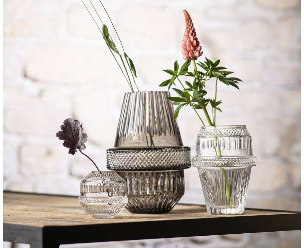 Une gamme de trois vases en cristal clair taillé diamants et biseaux. La forme des vases au col refermé permet d’y placer aussi bien des bouquets minimalistes que des compositions florales plus opulentes. Une collection à l’esthétique atypique, qui raconte sa propre fabrication.