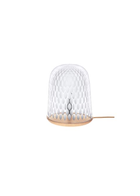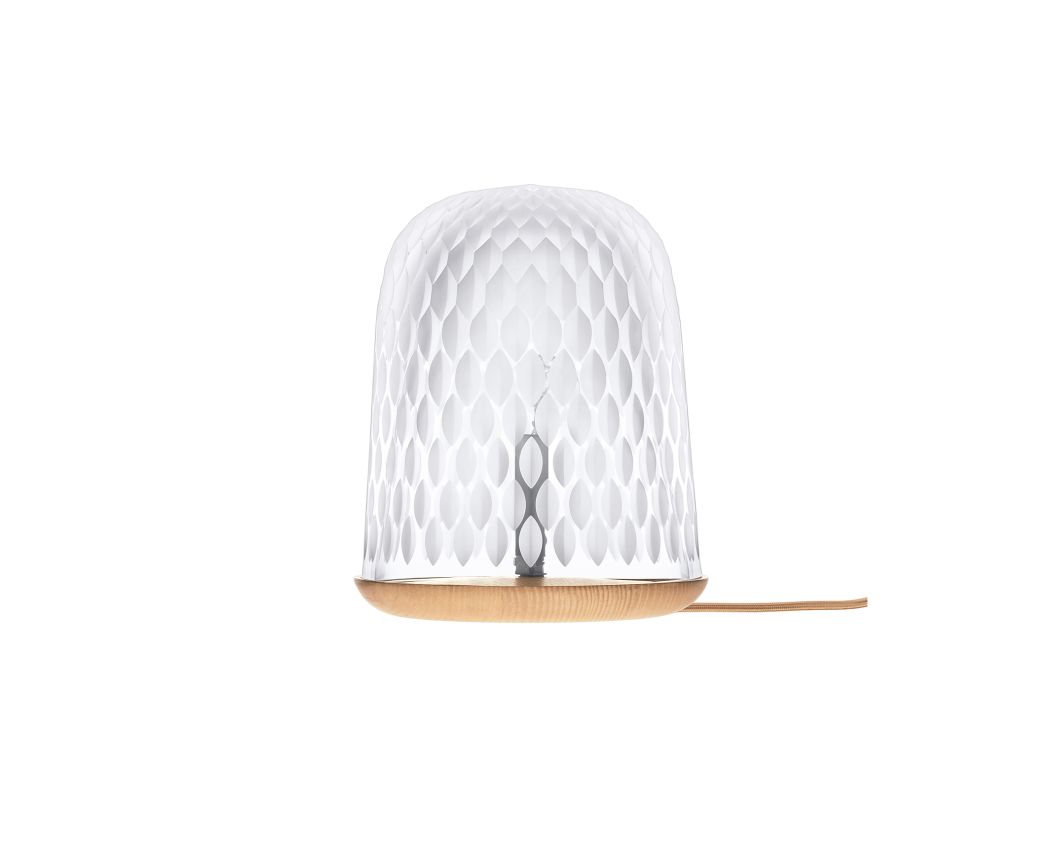 Sa cloche, proportionnée en fonction du socle, accueille en son centre une ampoule halogène surmontée d’un cache bougie. Le décor taillé de biseaux, géométriques et cadencés tel un dallage sur le sommet, s’épanouit pour retrouver sa forme végétale au contact du bois. La lumière le traverse, dévoilant avec chaleur l’éclat des tailles satinées et la finesse du jeu graphique.