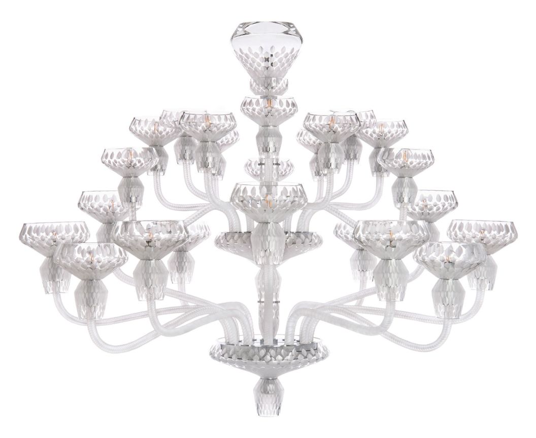 En utilisant la structure d’un lustre classique, Noé Duchaufour-Lawrance a créé trois lustres contemporains, donnant lieu à une nouvelle typologie de produits uniques et résolument modernes. La taille géométrique du cristal se déploie le long des coupes, bobèches et balustres en cristal clair.