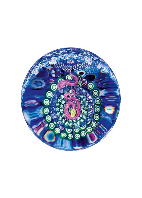 Dans ce presse-papier en cristal, le serpent semble être le personnage espiègle d’un dessin animé haut en couleur. Il se pare de deux couleurs complémentaires : le vert et le rouge. Sa tête est en cristal vert pâle et son corps est façonné grâce à un assemblage de bonbons de millefiori rouge et bleu.