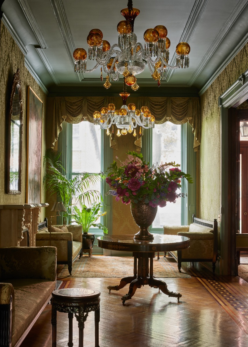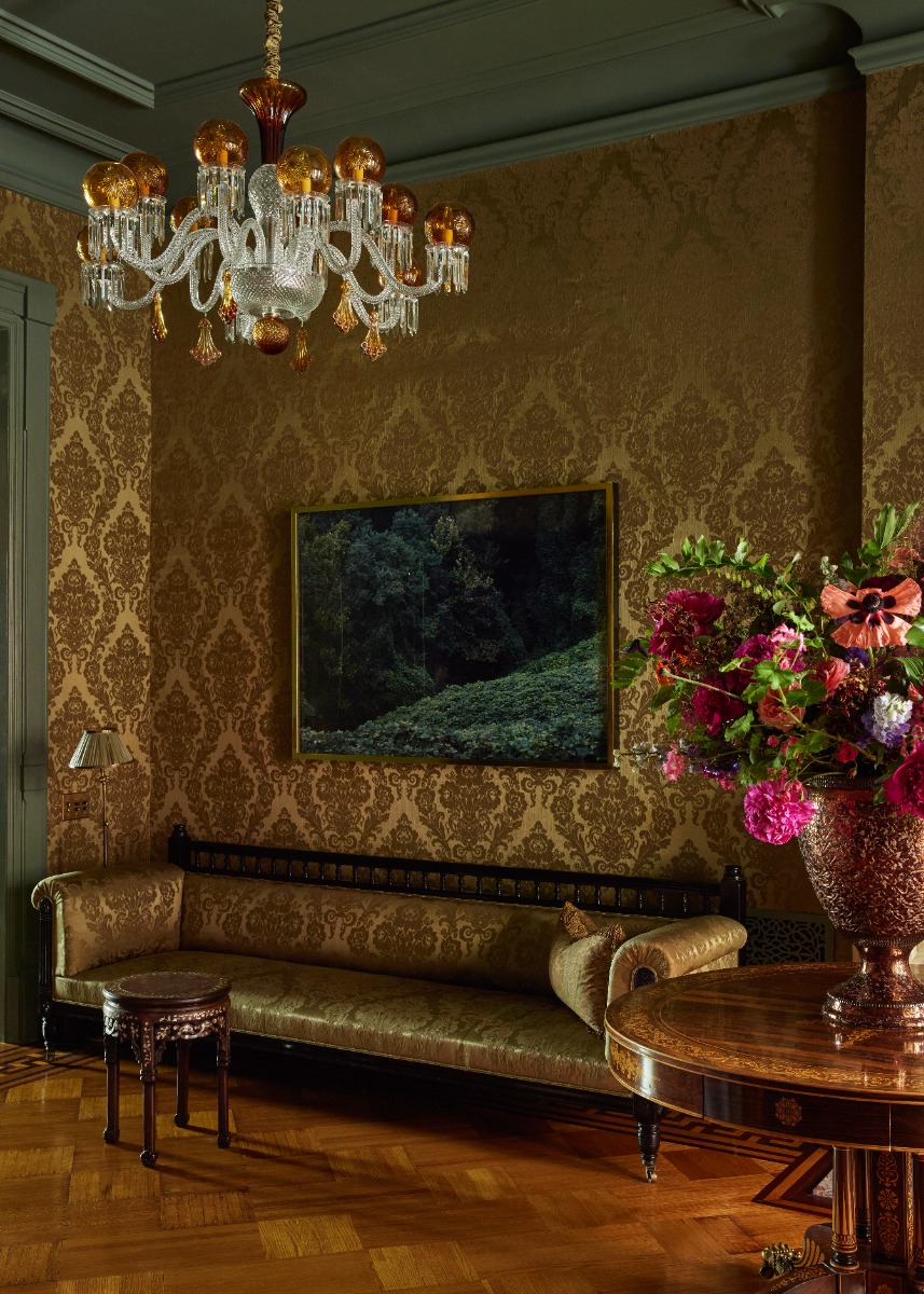 Le design de Billy Cotton illustre la fusion harmonieuse entre l’opulence victorienne et la clarté moderne. Le lustre Maharadja et les murs en damas doré évoquent la grandeur des intérieurs du XIXᵉ siècle, tandis que les accents botaniques contemporains et audacieux introduisent une sensibilité fraîche et tournée vers l’avenir. Les textures riches et les antiquités soigneusement sélectionnées s’équilibrent avec des lignes épurées et une retenue subtile — créant un espace à la fois intemporel et actuel.