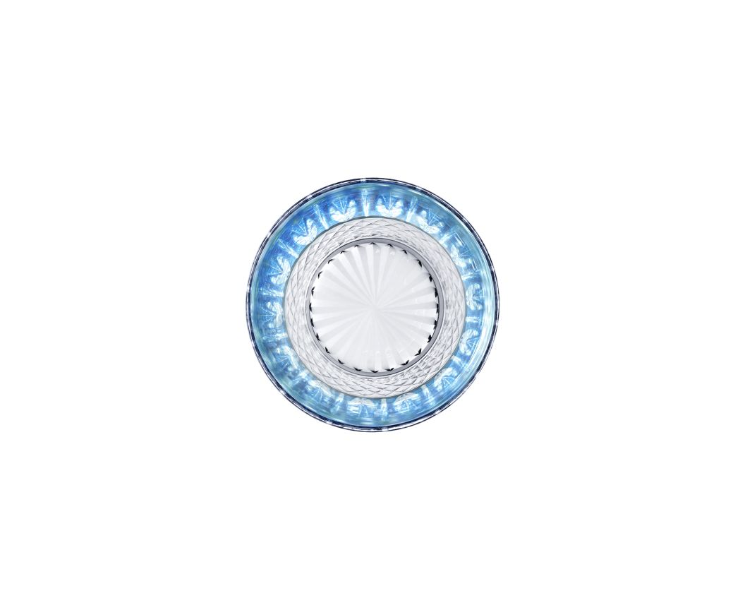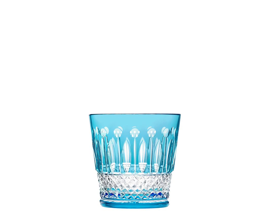 Le verre old fashion moyen n°3 bleu clair petit fait partie d'un service de table en cristal de couleur. Celui-ci se compose également d'un roemer, une flûte à champagne, une chope, un gobelet cylindrique petit et un verre à cocktail.