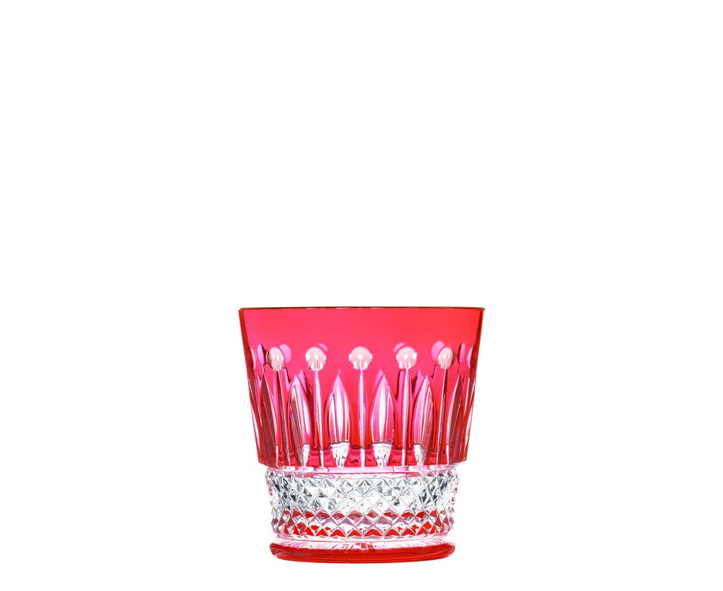 Le verre old fashion moyen n°3 rouge petit fait partie d'un service de table en cristal de couleur. Celui-ci se compose également d'un roemer, une flûte à champagne, une chope, un gobelet cylindrique petit et un verre à cocktail.