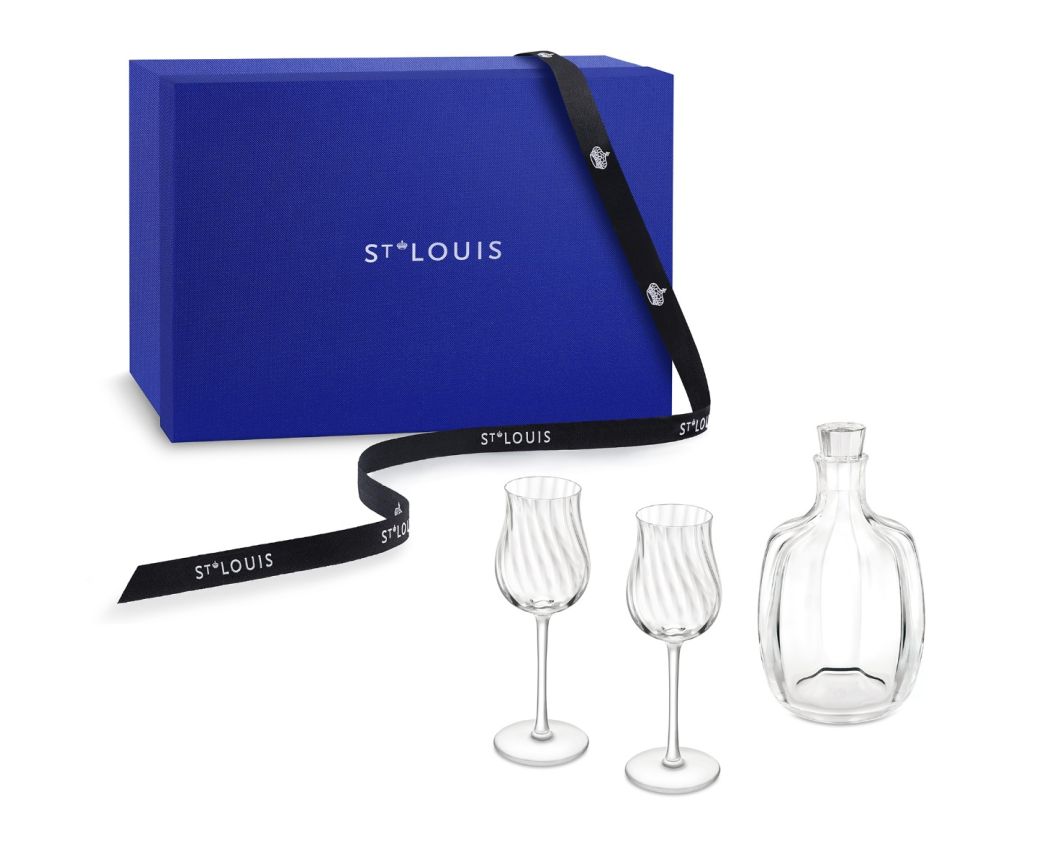 Coffret de deux verres à spiritueux du Paradis et un Flacon à spiritueux. Côtes vénitiennes étroites et twistées sur le corps. Buvants ouverts.