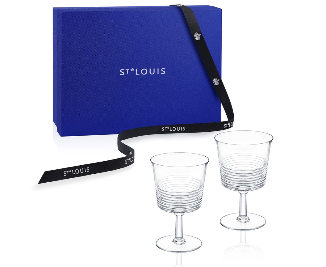 Set di due bicchieri da acqua in cristallo trasparente #2. Baricentro basso, nervature verticali piatte sugli steli e cordoni orizzontali sulle parigine. Labbra svasate.