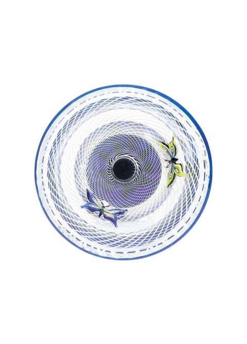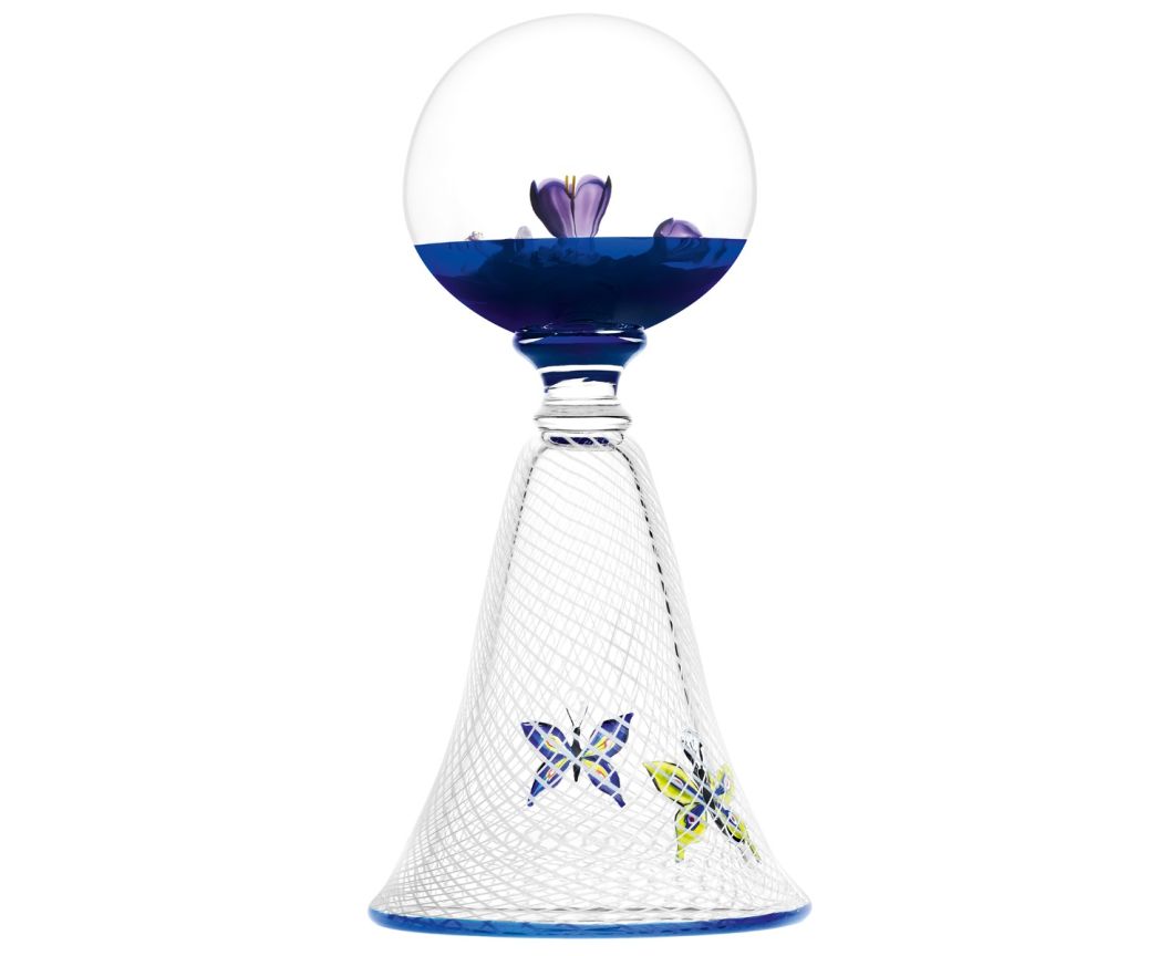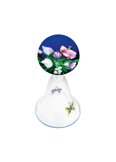 Sotto questa sfera si trova un cono svasato decorato in filigrana: sottilissimi fili di cristallo smaltato bianco si intrecciano all'interno del cristallo trasparente per rappresentare le maglie di una rete per farfalle. Vi sono impigliate due farfalle, una blu scuro e l'altra verde brillante. Volano verso la sfera di cristallo e i suoi fiori. La rete per farfalle termina con un bordo blu scuro.