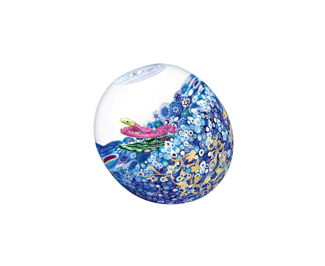 Vigile e vigile, l'ipnotica creatura è arrotolata su un letto di millefiori verdi che galleggiano sopra un'affascinante cornice blu. Quest'ultima presenta un generoso assortimento di gocce di zucchero blu scuro, blu chiaro e bianco. Dalla sua postazione, il serpente osserva ciò che accade dall'altra parte del cristallo. Un cerchio tagliato nella parte superiore della sfera di cristallo crea un effetto di ingrandimento, consentendoci di osservare con discrezione il serpente e di immergerci nel suo mondo scintillante.