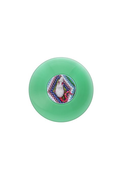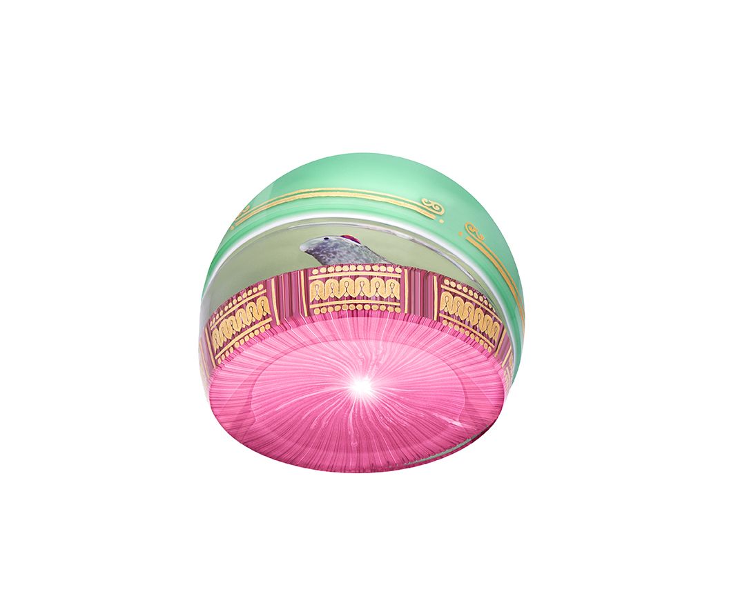 • Il ratto, che si distingue tra i segni zodiacali asiatici per la sua astuzia e malizia, si nasconde sotto una ciotola. Il suo corpo delicato è lavorato a mano, con la tecnica della fiamma ossidrica, e viene ingrandito dal taglio superiore attraverso il quale si può osservare. È adagiato su un fondo millefiori composto da diversi rombi colorati con toni pastello e che simboleggiano i dolci. È infatti per ingordigia che il topo si è infilato sotto la ciotola, rappresentata da una calotta di smalto bianco rivestita di cristallo verde che ricorda la ceramica celadon asiatica. Le tecniche come i tagli complessi e il taglio a smusso che disegnano la decorazione della ciotola fanno di questo fermacarte un pezzo tecnico e poetico al tempo stesso. Non si può fare a meno di girarlo per rintracciare finalmente l'animale maligno.