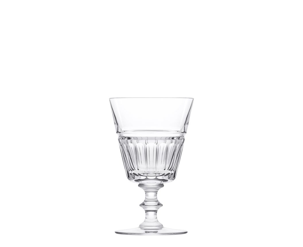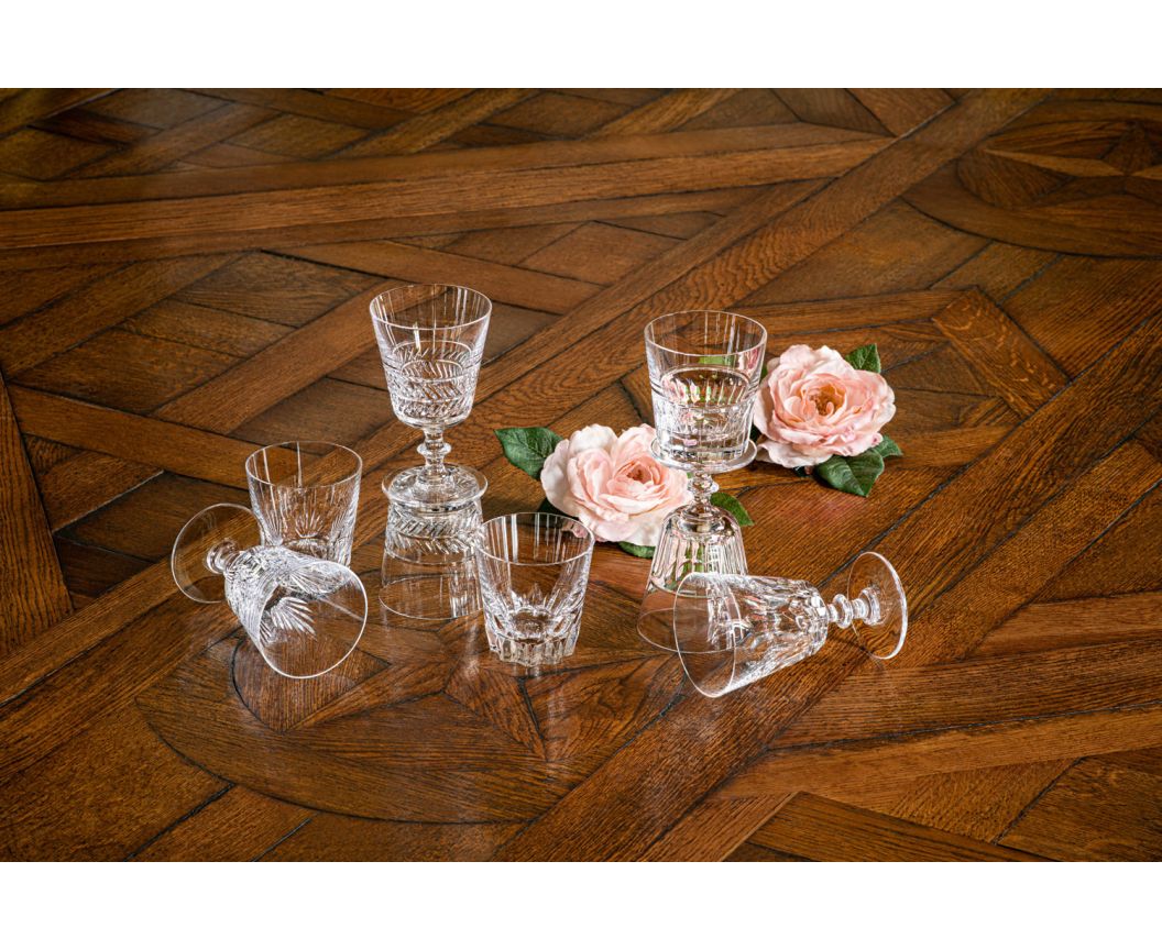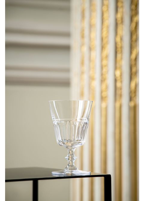 Bicchiere Maria Amelia in cristallo chiaro, sagomato con tagli a bordo dritto e cordone smussato. Le placche a côtes (tagli piatti) che impreziosiscono i vetri Maria Amalia ricordano gli elmi dei cavalieri, collegando la collezione alla Sala delle Crociate delle Gallerie Storiche del Palazzo, inaugurata da questa regina. È anche un cenno alla forza del suo impegno nella beneficenza e alla sua affinità con lo stile neo-medievale che era di moda nella sua epoca. Maria Amalia di Napoli e Sicilia (1782-1866), l'ultima regina del popolo francese, si distinse per il suo impegno nella beneficenza. Regnò sul popolo francese al fianco di Luigi Filippo e aprì con lui un museo nella Reggia di Versailles.