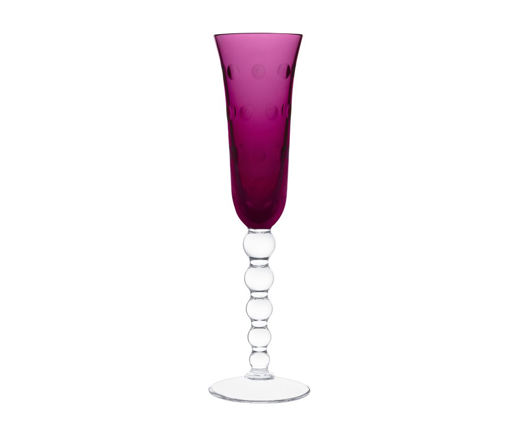 Un caratteristico piedino a forma di biglie, maliziosamente impilato, che dà la sensazione di bolle scintillanti trovate sparse a go go. Un servizio da tavola completo in cristallo trasparente e colorato, completato da oggetti decorativi tra cui portacandele, vasi e ciotole.